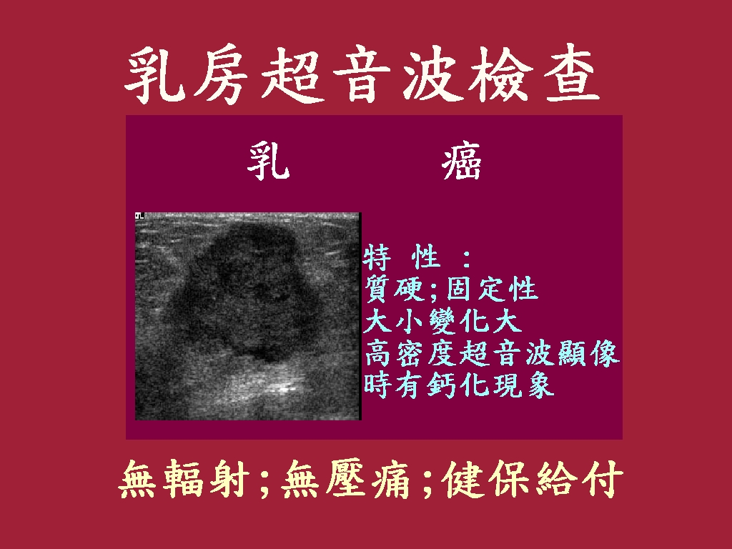 乳房疾病的診斷,經由醫師的觸診及病患提供的資料,已經可以得到初步的臆診,但是若要進一步獲得肯定的結果,則需要依靠其它影像工具,如X光乳房攝影、超音波,以及針吸細胞學檢查等。 對於乳房病灶,我們最關心的是乳癌的診斷,當然要得到確定的診斷有時需要依賴病理切片。但是若能經由影像的判斷而減少較具侵入傷害性的診斷步驟,應該是我們努力的目標。使用超音波檢查,對病人並無放射線顧慮,且不需任何準備,檢查費用亦較低,是輔助臨床檢查與X光乳房攝影,區別乳房病灶的頗佳工具,尤其新近的超音波掃描儀具有1OMHz以上的高解析探頭, 可以在術前協助診斷。