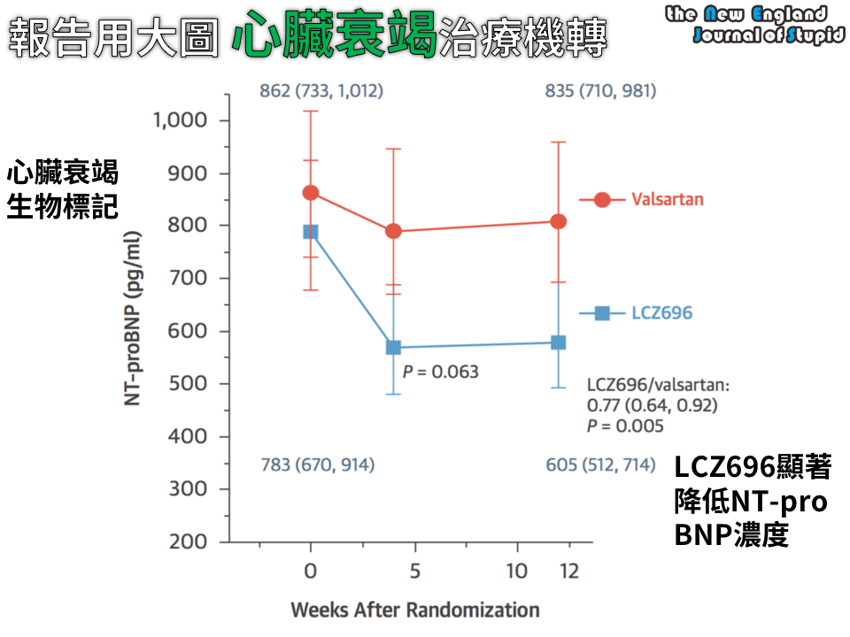 ¦¬ÁY¥\¯à¤ßŦ¥\¯à¤£¥þ (heart failure with reduced ejection fraction)¡×¤ßŦ¦¬ÁY¥\¯à¤U°³y¦¨ªº¯gÔ¸s¡A¨Ò¦p©I§l§xÃø (dyspnea)¡B¤ô¸~ (edema)¡B¹B°Ê¥\¯à¤U° (exercise intolerance) µ¥µ¥¡C ¡§¥æ·P¡BµÇ¯À¡B§Q¶uÐ`–¦¤T¤j¨t²Î¡¨ ¤HÅéµL¤ñ¶ø¯µ¡A¦ý¤]¤£¬O¸U¯à¡A·í¤ßŦ¦¬ÁY¥\¯à¤U°«á¡A¥æ·P¡BµÇ¯À¦åºÞ±i¤O¯À¡B§Q¶uÐ`–¦¨t²Î¬ÛÄ~¬¡¤Æ¡C ¥æ·P¡BµÇ¯À¨t²Î¬¡¤Æ«á¡A¼W¥[µÇ¯À (renin) ¤Àªc¡A±µµÛ´N¬O¼ôª¾ªº¡u¦åºÞ¥[À£¯ÀI¡BII¡v¡B¡u¦åºÞ¥[À£¯À¨üÅé¡v¡A¦¬ÁY¦åºÞ¡B¼W¥[îÇ©Tଠ(aldosterone) ¤Àªc¡C Wiki¡Galdosterone ³o¸Ì ³Ì²×´£¤É¦åÀ£¡B³y¦¨¶uÂ÷¤lº¢¯d¡C §Q¶uÐ`–¦ (natriuretic peptide) »P¥æ·P¯«¸g¡BµÇ¯À¨t²Î¬Û¤Ï¡A§Q¶uÐ`–¦¤Àªc«á¡A¤Ï¦Ó¬O§Q¶u («P¶i¶uÂ÷¤l±Æ°£) ¥H¤Î¦åºÞÂX±i§@¥Î¡C ·íµM¡A§Ú̧Ʊ檺·|¬O¡u§í¨î¥æ·P¡BµÇ¯À¨t²Î¡v¤Î¡u¼W¥[§Q¶u¨t²Î¡v§@¥Î³á¡I ¡§LCZ696¦P®É§@¥Î¦bµÇ¯À»P§Q¶uÐ`–¦¨t²Î¡¨ °£¤F¤A«¬ªýÂ_¾¯ (beta-blockers)¡B¦åºÞ±i¤O¯ÀÂà¤Æ–¡§í¨î¾¯ (ACEI) ¤Î¦åºÞ±i¤O¯À¨üÅé«ú§Ü¾¯ (ARB)¡BÂ÷¤l©T¾J¨üÅé«ú§Ü¾¯ (MRCA) ¥~¡ALCZ696¦P®É§@¥Î¦bµÇ¯À»P§Q¶uÐ`–¦¨t²Î¡C LCZ696 = Valsartan (¤@ºØARB) / Sacubitril (NEP§í¨î¾¯) ²V¶Ã¤Fóø¡ISacubitril§í¨îNEP (neprilysin)¡A¦ÓNEP§í¨î§Q¶uÐ`–¦ (ANP©ÎBNP) §@¥Î¦b¨üÅé¡A©Ò¥Htt±o¥¿¡A¦]¦¹¼W¥[§Q¶u¨t²Î§@¥Î¡C |