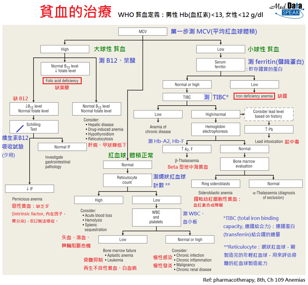 貧血,就是紅血球 (RBC)、血紅素 (Hb)過低的一大類疾病 (由許多原因所造成)。Hb過低會造成全身的氧氣運輸不足,而導致疲倦、呼吸困難、心跳加快、暈眩、皮膚蒼白、怕冷等症狀。 造成貧血的病因有很多,不外乎三大機轉:出血、紅血球生成減少 (缺乏鐵、B12、葉酸)、破壞增加 (溶血性貧血),找到根本原因並加以治療,才能把貧血治療到位。需要一步步做的檢查和可能的病因如流程圖,不贅述囉。 以下分享院內治療的藥物。 —————————- 缺鐵性貧血 (iron-deficiency
