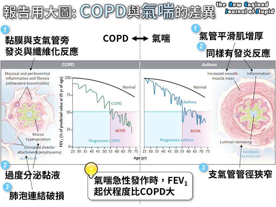 慢性肺阻塞疾病 (COPD) 是一種氣流阻塞疾病,特徵是氣管與肺的發炎反應 (幾乎什麼疾病都跟發炎有關,抱怨一下)。 COPD通常可以分為兩種類型,分別是慢性支氣管炎 (chronic bronchitis) 與肺氣腫 (emphysema)。 慢性支氣管炎=慢性咳嗽加痰,每年超過三個月,連續兩年。 肺氣腫=肺泡破壞的一種病理特徵。 “急性發作是COPD最嚴重的併發症” COPD急性發作 (acute exacerbation) 指的是COPD病人呼吸功能快速下降,伴隨症狀,是COPD病人急診、入院最常見的原因。 因此,藥物治療的目的在於: (1) 延緩COPD進程、延緩呼吸功能惡化。 (2) 減少急性發作次數。 “COPD與氣喘不同,但可能同時存在” |