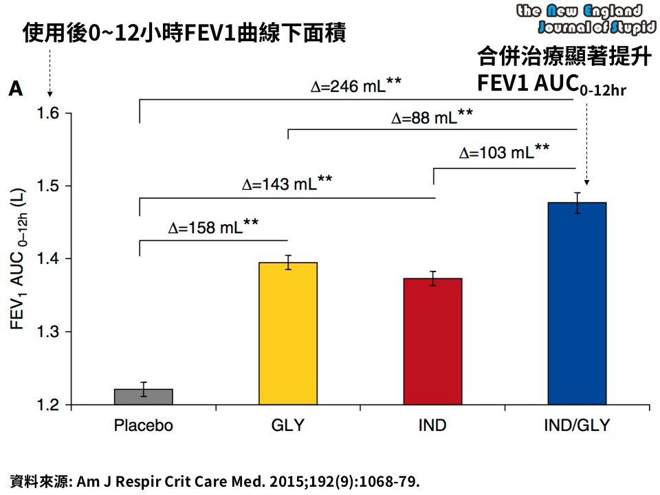 相較於單獨使用,合併治療顯著提升肺功能 (以0~12小時FEV1曲線下面積評估)、改善症狀 (以SGRQ問卷評估),因為副作用停用比例,合併治療與單獨使用並無顯著差異。 編按:這項研究的副作用停藥比例,即使在合併治療組也只有2%,令人XX (XX = 自行填入)。