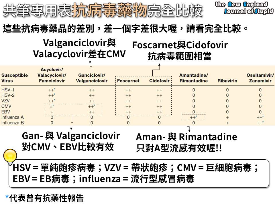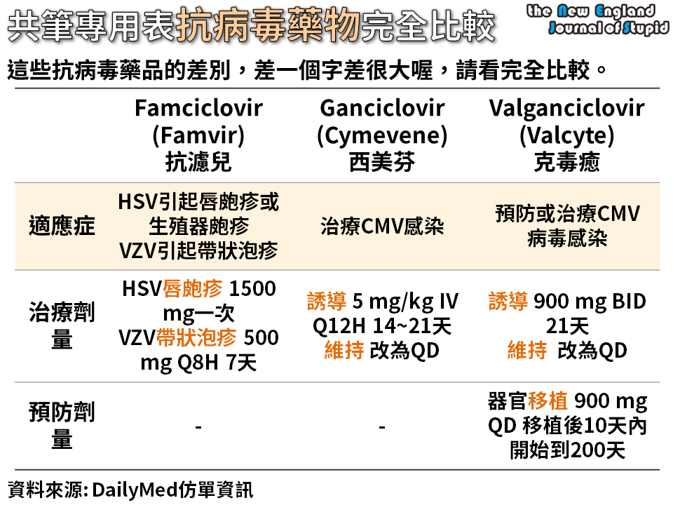 Acyclovir¡BGanciclovir¡BValacyclovir¡BValganciclovir¡A¥i¥H¤@¬í§PÂ_¤§¶¡®t²§ªº¡A¥²©w¬O¹F¤H¡A¦]¬°³o¨ÇÃÄ«~³£³Q¥Î¨ÓªvÀø¤£±`¨£ªº·P¬V¯g¡A¯f¬r·P¬V¡C ³o¨Ç¦W¦r¹³¡B¥Î³~¹³¡B¥±`¤S¥Î¤£¨ìªº§Ü¯f¬rÃÄ«~¡A§¹¥þ²Å¦XÈЮѨì¥Î®É¤è«ë¤ÖÈЪº·§©À¡C ³o¨Ç§Ü¯f¬rÃÄ«~¨ì©³¦³¤°»ò®t²§©O¡H ÈЯp¯l¯f¬r¤Þ°_ªº¯e¯f³£¥s¯p¯l¡A¦ý¨ä¹ê¤£¤@¼ËÈÐ §Ú̪º»Ùê¨Ó¦Û©ó¡A³£¬OÈЯp¯lÈЪü¡I ¦ý¬O³æ¯Â¯p¯l¯f¬r (herpes simplex virus, HSV) ¤Þ°_ªº¥Í´Þ¾¹¯p¯l (genital herpes)¡B®B¯p¯l (herpes labialis) µ¥·P¬V¡C »P±aª¬ªw¯l (varicella zoster virus, VZV) ¤Þ°_ªº±aª¬¯p¯l (shingles ©Î herpes zoster) ¬O¤£¤@¼Ëªº¡C Acyclovir¡BValacyclovir»PFamciclovir¹ï¥¨²ÓM¯f¬r (CMV)¡BEB¯f¬r (Epstein-Barr virus, EBV) ¬¡©Ê¤£°ª¡A¦ýGanciclovir»PValganciclovir¥i¥H¥Î©óªvÀøCMV»PEBV¯f¬r·P¬V¡C