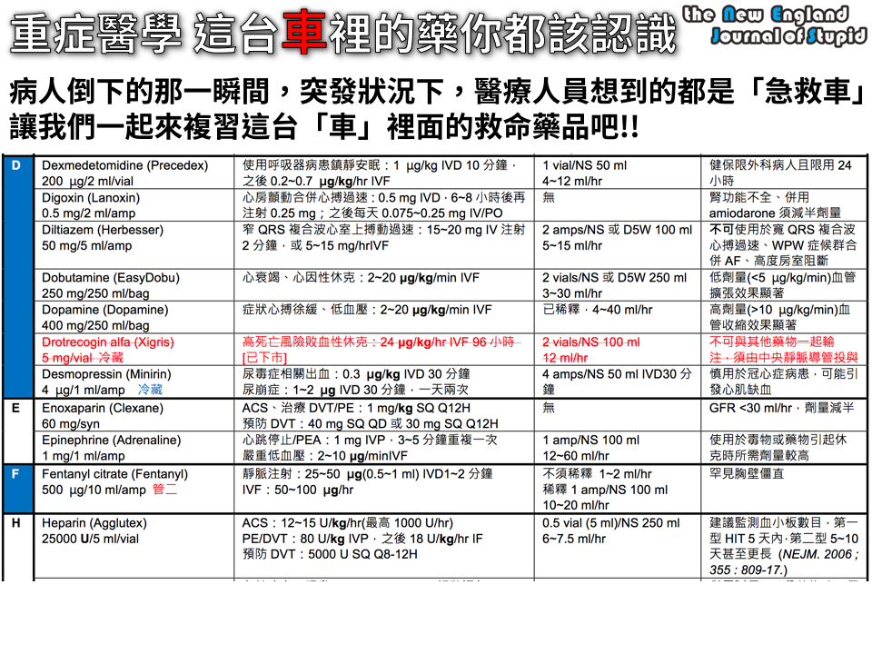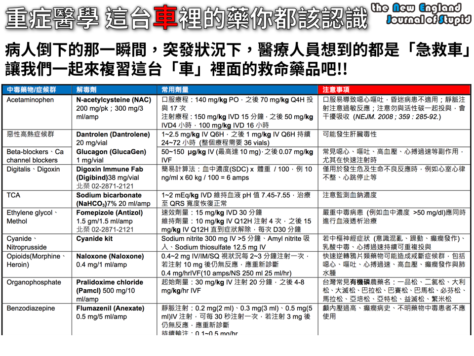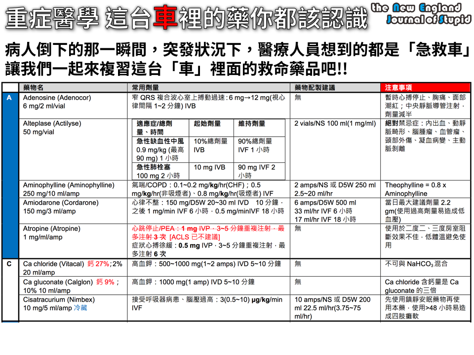 編按:急救藥品的使用多元,這裡所提供的建議,是根據藥品資料庫與教科書的資料,請依照臨床狀況與醫師醫囑使用。 醫院裡面最多的不是餐車、不是嬰兒車,而是「急救車」,這些車跟一般的治療車不同,裡面藏的都是急救用的藥品,很多更是「高警訊藥品 (high-alert medication)」。 有關高警訊藥品,請看:讓你黑人問號的高警訊藥品 (HIGH-ALERT MEDICATIONS) 本篇PO文的目的在於提供急救車常用藥品與解毒劑的建議用法與注意事項。 |