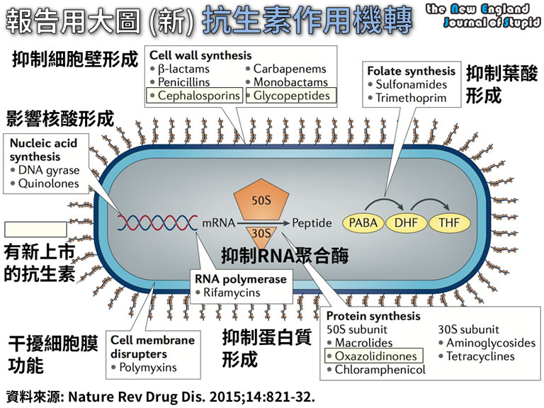 | ▲抗生素作用機轉大圖,黃底代表有新一代抗生素上市。