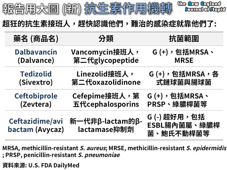 抗生素的研發並沒有太多進展,過去十年並沒有轟動武林驚動萬教的王牌出現,頂多「plus」版而已,再加上藥價一直砍。 大圖裡我們整理了最新上市的「接班人」們,分別是: (1) Dalbavancin:被稱為萬古黴素 (Vancomycin) 的接班人,可以有效對抗革蘭氏陽性菌,包括抗藥性菌種MRSA、MRSE等。被核准用於具感受性細菌造成的皮膚、軟組織感染。 (2) Tedizolid:看名字就知道,是采福適 (linezolid) 的接班人,同樣屬於「oxazolidinone」類抗生素,同樣對革蘭氏陽性菌有效,包括抗藥性菌種MRSA、VRE等,一樣被核准用於具感受性細菌造成的皮膚、軟組織感染。 (3) Ceftobiprole:號稱第五代頭孢子菌素 (cephalosporins),雖然該編們認為第幾代,其實並不是很好的分類方法,但就比較好記囉!相較於第四代最常見的cefepime,除了廣效還是廣效,射程範圍包括高抗藥性菌種的MRSA、PRSP (penicillin-resistant S. pneumoniae)、綠膿桿菌 (P. aeruginosa) 等。 (4) Ceftazidime/Avibactam:Beta-lactam與Beta-lactamase抑制劑的組合,基本就是飛彈開外掛的概念,單獨使用Beta-lactam抗生素,容易被細菌的Beta-lactamase分解,於是加上Beta-lactamase抑制劑,克服細菌的抗藥性。 Avibactam就是新一代的Beta-lactamase抑制劑,與可攻克綠膿桿菌的第三代頭孢子菌素Ceftazidime合體,除了一般革蘭氏陰性菌外,對惡名昭彰的ESBL (Extended-spectrum β-lactamases) 同樣有效。 被核准用於複雜性腹腔內感染 (complicated intra-abdominal infection)。 |