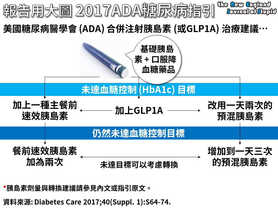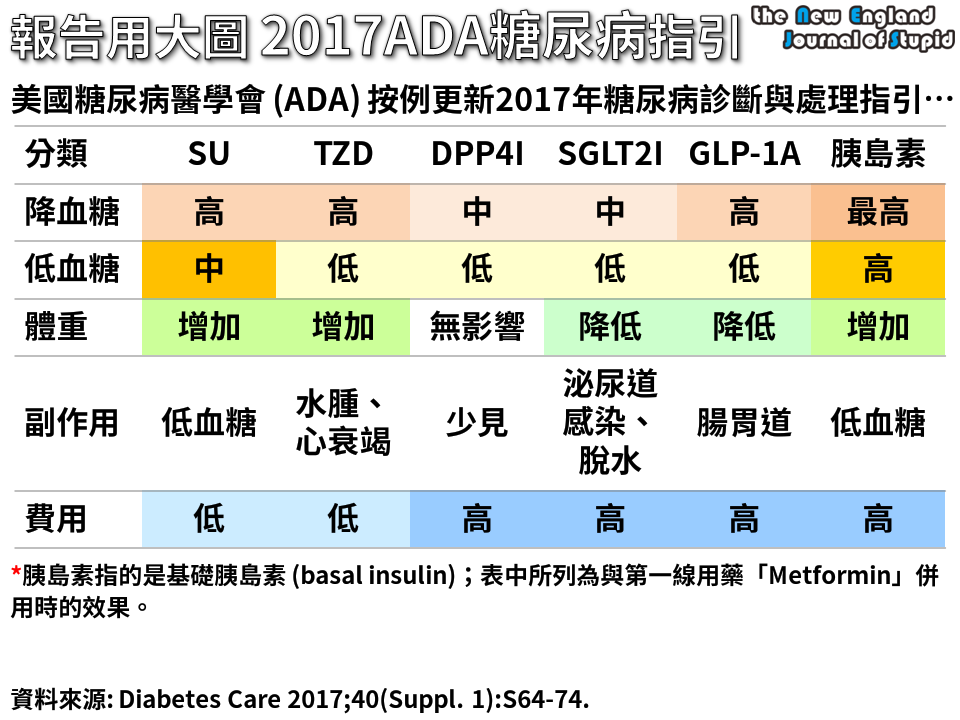 ¬ü°ê¿}§¿¯fÂå¾Ç·| (ADA) 2017¦~¿}§¿¯f¶EÂ_»P³B²z¼Ð·Ç·ÓÅ@¡A¥þ¤å¤U¸ü (PDF)¡C ¥h¦~ (2016¦~) À³¸Óºâ¬O¿}§¿¯fªvÀøªº«¤j¶i®i¦~¡A³\¦h¤fªA°¦å¿}ÃÄ«~ (OHA) ¦b¤ß¦åºÞ¹w«á¬ã¨s¤¤¦³©Ò±ÙÀò¡A¹ï¯f¤H»PÂåÀø¤Hû¨Ó»¡³£¬O«Ü¦nªº®ø®§¡C Èа_©lªvÀø¤´µM¥HMetformin¬°¥D¡A¦X¨ÖªvÀø»ÝÓ¤H¤ÆÈÐ ADA¨C¦~³£·|§ó·s¿}§¿¯f«ü¤Þ¡A°w¹ï°_©lªvÀø (initial therapy)¡C ¦pªG°_©l¿}¤Æ¦å¦â¯À (HbA1c) ¶W¹L9%¡A½Ð¦Ò¼{¦X¨ÖªvÀø¡C °_©lHbA1c¶W¹L10%¡A©Î¯f¤H¦³©úÅã¯gª¬¡A½Ð¦Ò¼{¦X¨ÖÈЪ`®gÈЪvÀø¡C ½s«ö¡Gª`®gªvÀø¤£¥u¯Ø®q¯À¡AÁÙ¦³GLP1 RA (glucagon-like peptide 1 receptor agonist)¡C Metformin¦³µÛ«K©y¡B°¦å¿}®ÄªG¦n¡B¤£·|¼W¥[Å髵¥ÀuÂI¡A¦ý¥u¾a¤@ÓMetformin´N¥i¥H¹F¨ìéw¦å¿}±±¨îªºÃø«×¦³ÂI°ª¡A¦]¦¹¡A½Ö¬O²Ä¤G¡A´N¬O«ÂI¤F¡C ADAªº«ü¤Þ¤¤¡A¦³²Ä¤G½uÃÄ«~ªº¤ñ¸û¡A®Ú¾ÚÓ¤H¯S©Ê¡A¨Ò¦pÅé«¡B¦~ÄÖ¡BªvÀø¥Ø¼Ð¡B§C¦å¿}·ÀIµ¥µ¥¡A¦Ò¶q³Ì¾A¦Xªº²Ä¤G½uÃÄ«~¡A¬O¥Ø«eªº°µªk¡C ÈЦX¨Öª`®gªvÀø¥H°ò¦¯Ø®q¯À¬°¥D¡A¨Ì·Ó¤ÏÀ³½Õ¾ãÈÐ |